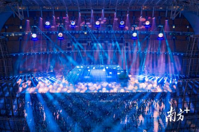 开幕式上,主舞台突破传统局限,以观众席方向为主舞台,将传统岭南文化与现代科技有机融合,通过科技机器狗、灯光狮等创新元素与多元表演,打造了一场演员与观众双向奔赴的沉浸式盛宴,完美实现了艺术表达与全运活力的交融。
