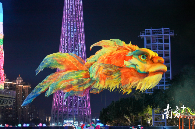 亮灯仪式上,广州塔、东塔、西塔首次实现三塔联动上演璀璨光影秀,一头集现代光雕技术与传统美学于一身的“鳌鱼”成为全场焦点,其流光溢彩的身姿盘桓而起,以磅礴气势点亮花城夜空……