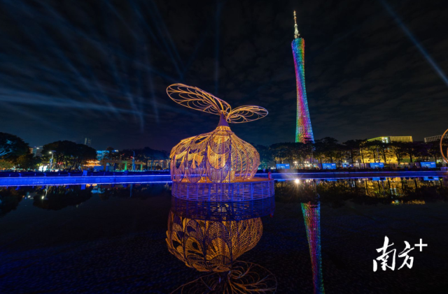 在花城广场北广场、中广场,海心沙亚运公园星光大道等区域,广州园林博览会的花卉景观与广州国际灯光节的光影装置以穿插布局、彼此呼应的形式呈现,为市民游客创造了一个“花影共融”的观展体验。漫步在海心沙亚运公园星光大道上,迎面而来的竹艺作品让人眼前一亮。