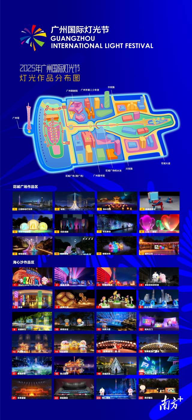 今年灯光节以主会场海心沙亚运公园、花城广场为核心,联动“珠江景观带”“新中轴区域”,构建“核心辐射、全域呼应”的光影格局。分会场延伸至一江两岸(沿江24栋建筑群、海印桥、猎德大桥、琶洲西区、琶醍筒仓、面粉厂)以及黄埔区等重点板块,构建了一条贯通东西、联动两岸的“光影走廊”。