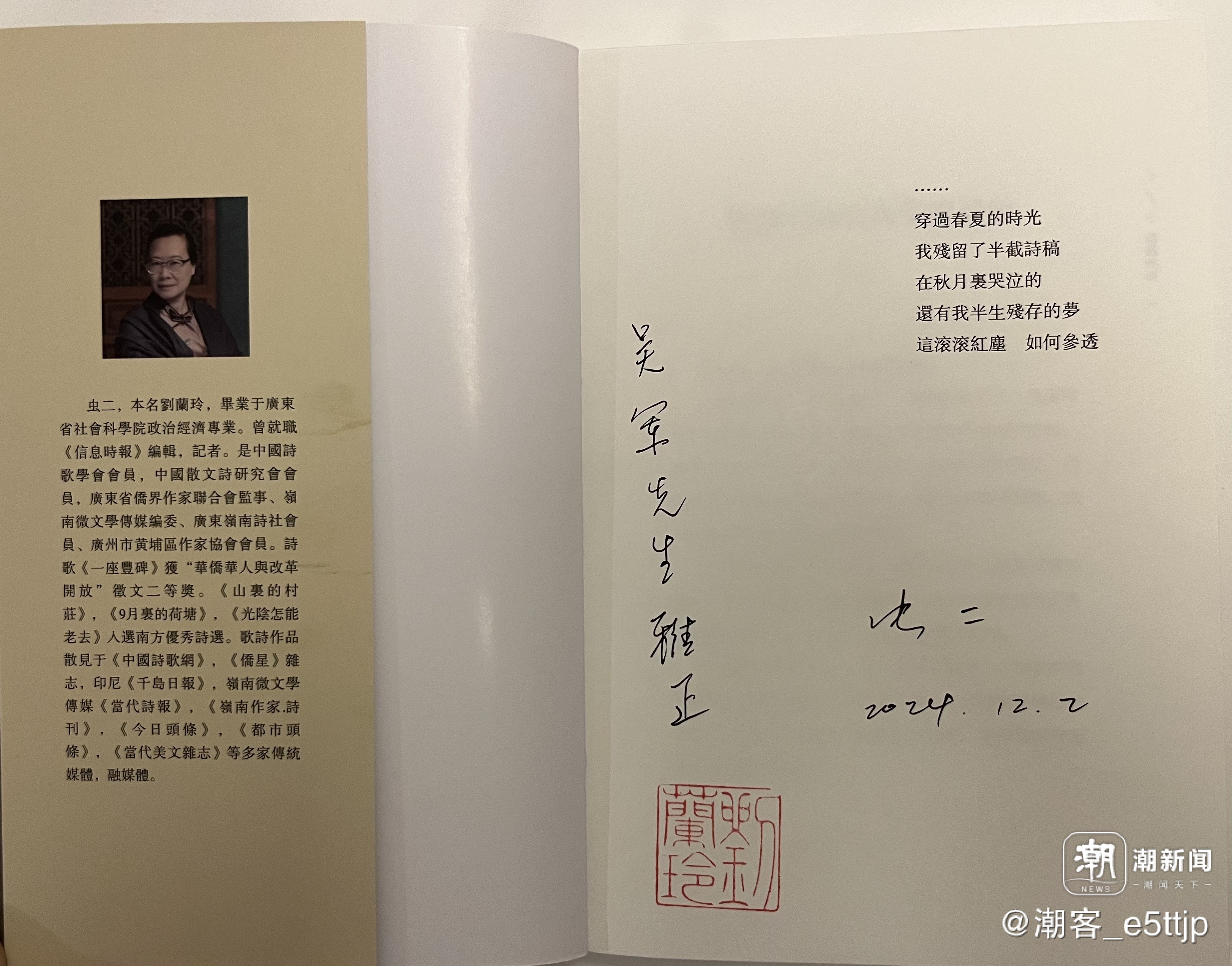 在当代华文文学的星空中,有这样一位创作者:她以“虫二”为笔名,在诗歌的世界里剥离浮躁,在散文的肌理中镌刻真诚;她曾是新闻场上敏锐的记录者,如今是跨文化传播中热忱的使者。她就是刘兰玲——集诗人、作家、编辑、记者、老年大学文学讲习班教师多重身份于一身,用文字搭建起连接个体与时代、本土与海外的精神桥梁。