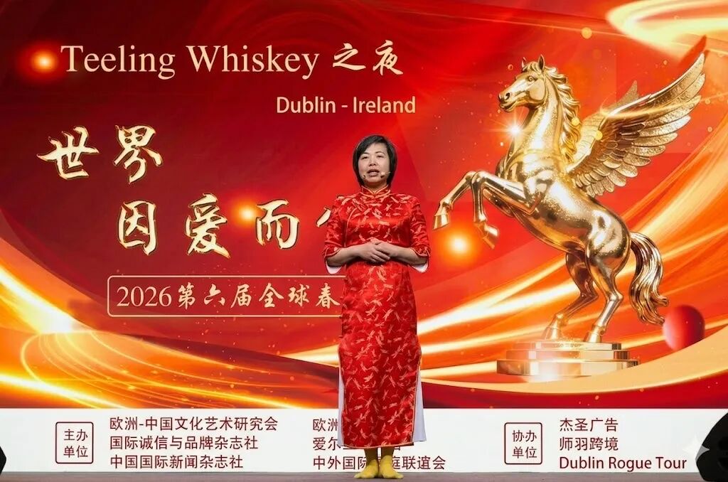 《都柏林公报》官网在报道中生动描述了晚会如何将中国传统文化精准植入爱尔兰文化土壤。在利博蒂区(The Liberties)标志性的帝霖(Teeling)威士忌蒸馏厂,原本沉稳的工业感建筑被绚烂的"中国红"点亮,百年橡木桶与东方美学交相辉映。报道盛赞策划人陈秋梅女士将舞台从传统剧院移至充满生活气息的实景展厅,这种"乔伊斯式"的先锋跨界尝试,让爱尔兰威士忌的温暖与农历新年的喜庆光芒完美交融,并且通过互联网的广泛传播,让农历新年焕发出极具现代感的国际生命力。