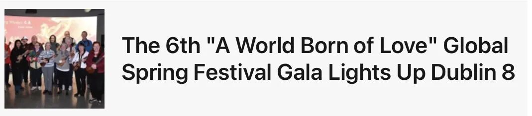 本报讯 (记者 胡陈嘉露)(都柏林讯)日前,爱尔兰颇具影响力的当地数字媒体《都柏林公报》(Dublin Gazette)官网以深度专题形式,详尽报道了第六届"世界因爱而生"全球华人春节联欢晚会。这不仅是对这场中西合璧艺术盛宴的高度赞誉,更标志着由著名侨领、资深策划人陈秋梅(Annie MacCarthy)打造的"世界因爱而生"全球春晚的文化品牌,已成功打破族裔壁垒,在海外互联网舆论场引发热烈反响,成为都柏林城市文化名片。