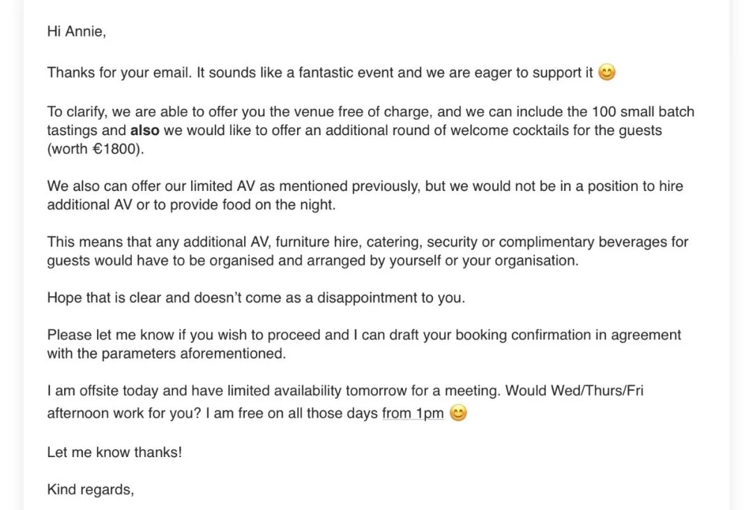 在过去的两个多月时间里,陈秋梅女士始终怀揣着热忱,全力以赴地为第六届“世界因爱而生”全球春晚寻找合适的举办场地。然而,这一过程充满了诸多挑战。大多数剧场都需要提前半年至一年进行预订,二月份适合的剧场都已满档。就在陈秋梅女士打开邮件,准备预订一家3月9日才开始有空档的心仪剧场时,命运却在这个时候给了她一个意外的惊喜。前天她联系过的一家威士忌品牌方,于早上10点发来邮件告知,他们非常乐意为活动提供免费场地,并且还会赠送100瓶威士忌样品供宾客品尝。