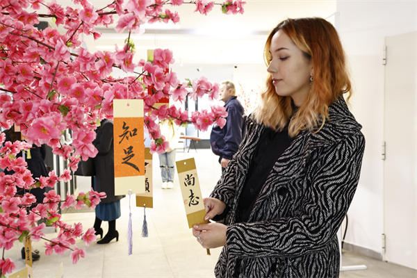 经典名著《喻世明言》第一卷《蒋兴哥重会珍珠衫》、90岁高龄的汉学家多罗班图所译《水浒传》节选罗语版在罗首次发布,吸引众多中国古典文学爱好者交流讨论。出版社展位前读者络绎不绝,展出图书品类丰富,既有《习近平谈治国理政》《庄子》《三体》等作品的罗马尼亚语译本,也有一系列由当地学者撰写的涵盖当代中国政治、经济发展、传统文化与社会变迁的原创著作,满足不同年龄段读者的阅读需求。活动现场精心布置的小型书法展同步向观众开放,展区以素雅宣纸与毛笔书法作品为主体,呈现了七岁的罗马尼亚汉字书法爱好者西蒙•亚博勒的创作,将汉字的线条之美与哲学意蕴融入空间之中。