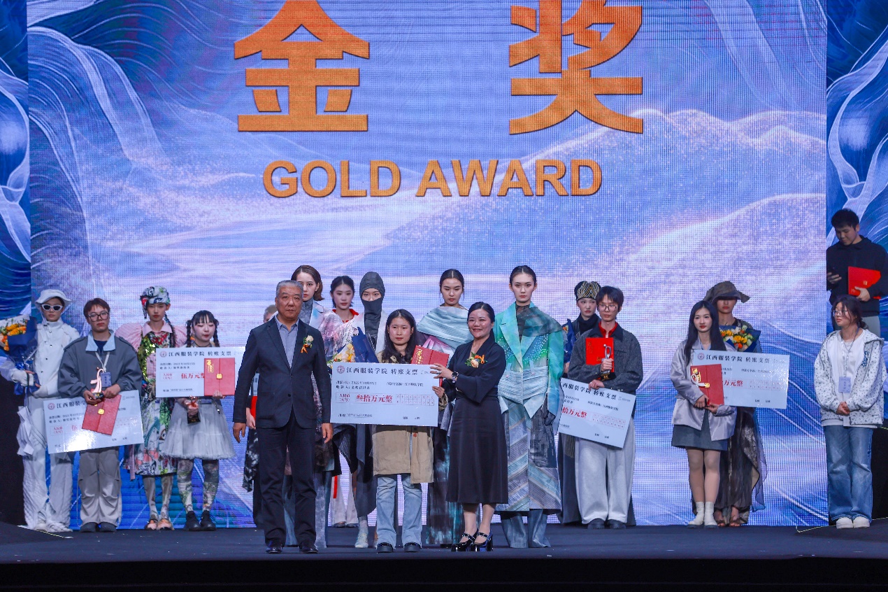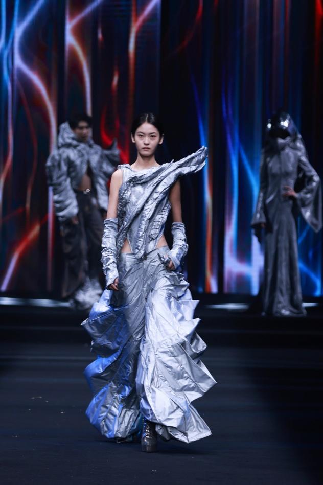 颁奖环节成为闭幕式的核心亮点,多项荣誉逐一揭晓。作为赛事重头戏,“润华奖” 一带一路大学生时装设计与技能大赛颁奖仪式压轴举行。江西服装学院徐佳丽同学的作品《黯缄·光溃》摘得大赛金奖;鲁迅美术学院王镇逍同学的作品《叠影》、清华大学美术学院李佩璇、高元睿同学的作品《琅篁锦书》荣获大赛银奖;巴黎国际裁剪学院ANNE BARATTE的作品《IN.VISIBLE》、日本文化服装学院HINAE KATSURA的作品《REMAIN A GIRL》、北京服装学院宋杭峰、王浩鑫的作品《巳时和磁》荣获大赛铜奖。现场还颁发了国际最佳选手奖 8 名、设计之星奖 8 名、优秀奖 12名。获奖作品既彰显审美张力,又贴合市场需求,展现了时尚教育与产业实践深度融合的丰硕成果,也印证了大赛作为服装教育“成果展” 与人才培育 “孵化器” 的重要价值。