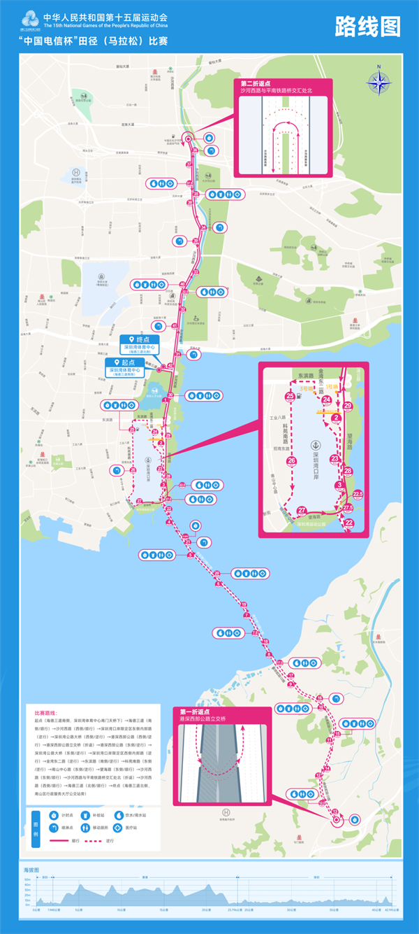 运动员们途经望海路、人才公园,大沙河生态长廊的绿意与深圳湾的壮阔海景交相辉映,每一步都展现着城市活力。踏上深圳湾大桥,桥身如飞虹跨海,双城轮廓在晨光中渐次清晰。